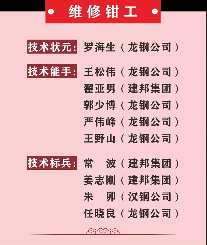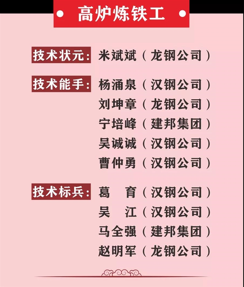薛繼虎宣布表彰決定。本次競(jìng)賽,來(lái)自陜西省機(jī)械冶金建材系統(tǒng)11家參賽單位以及西北聯(lián)鋼3家山西鋼鐵企業(yè)的137名參賽選手,經(jīng)過(guò)3天的激烈角逐,最終在高爐煉鐵工、冶金天車工、分析化驗(yàn)工、維修鉗工4個(gè)工種競(jìng)賽中產(chǎn)生了陜西省機(jī)冶建材系統(tǒng)“技術(shù)狀元”4名、“技術(shù)能手”20名、 “技術(shù)標(biāo)兵”16名,其中分析化驗(yàn)工和冶金天車工兩個(gè)工種競(jìng)賽還產(chǎn)生了“優(yōu)秀獎(jiǎng)”15名,并在閉幕式進(jìn)行表彰頒獎(jiǎng),還表彰了優(yōu)秀組織單位和優(yōu)秀組織個(gè)人。對(duì)獲得本次大賽高爐煉鐵工、冶金天車工前3名的選手將由組委會(huì)推薦省有關(guān)單位授予“陜西省技術(shù)能手”稱號(hào)。
