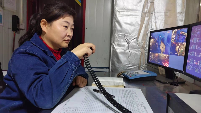 推鋼室內(nèi),推鋼工雷蕾在認(rèn)真操作著,另一名推鋼工邱潔在書寫推鋼記錄。因?yàn)槭峭膺\(yùn)鑄坯,推鋼室不斷有司機(jī)進(jìn)出開票,她們毫無(wú)怨言,熱情接待。