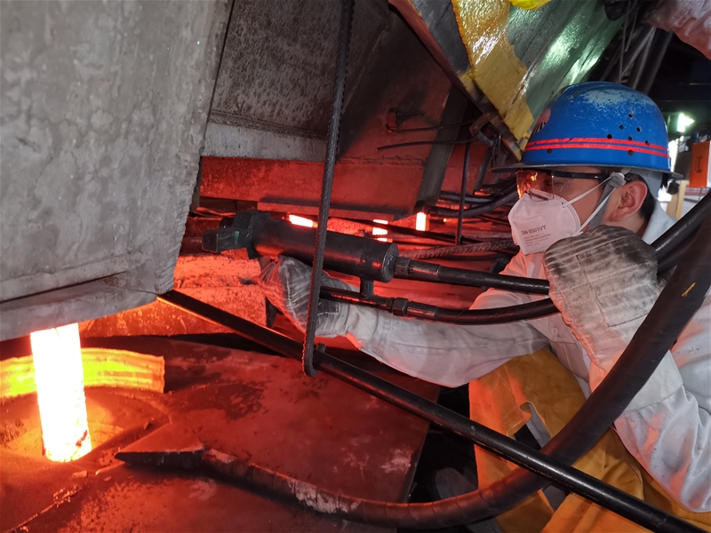 臺下推鋼機處,陣陣焊花燦爛奪目,仔細一看,原來是支援的維修工們正在對推鋼機大梁進行校正,幾名維修工人手一把焊槍、一個面罩,忙得不亦樂乎,雖然氣溫已到零下,但他們黝黑的臉龐爬滿了汗珠。