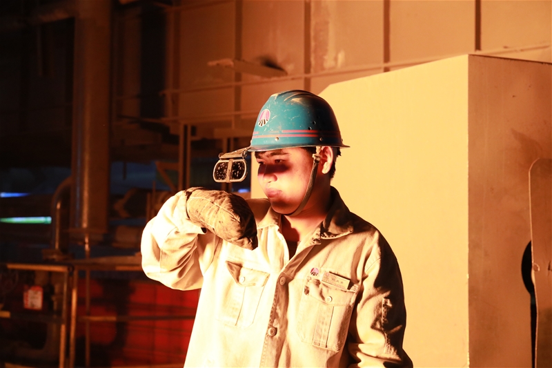 8點(diǎn)30分,6#轉(zhuǎn)爐操作室內(nèi),姚永青正全神貫注地扳動(dòng)操縱桿,室外的轉(zhuǎn)爐緩緩轉(zhuǎn)動(dòng)。頓時(shí),一股灼人的熱浪逼來(lái),轉(zhuǎn)爐張開“火”盆大口,內(nèi)壁像巖漿表面隨時(shí)能噴出火來(lái)。刺眼的紅光逼得人睜不開眼睛,姚永青卻專注地盯著火紅的爐膛,認(rèn)真地觀察爐況。一眨眼的功夫,姚永青已經(jīng)沖到了爐前。再回來(lái)時(shí),他的汗正順著頭發(fā)往下滴,衣服已經(jīng)被汗水浸透。據(jù)了解,這樣的工作,他每天要重復(fù)十幾次。