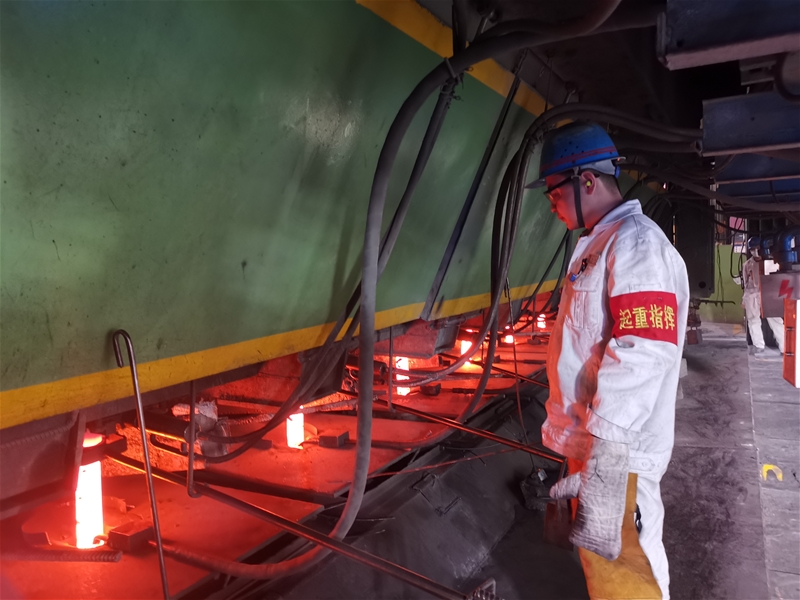 “快,四流紅坯未割斷…”推鋼工通過對講機著急地向臺下人員反饋信息。接到通知,臺下組長陳成林戴上手套,一把抓起割槍,邁開步子沖向四流準備手工切割,另一名拉矯剪切工一邊開乙炔,一邊托起氧帶緊跟其后。找準位置站穩(wěn)后,其它幾個流的紅坯像是一條條火龍,從他們身旁穿梭而過。陳成林強忍著紅坯的炙烤、咬緊牙關,左手半遮著臉,右手緊握割槍對準切割位置,伴隨著切割的“滋滋”聲,紅坯一分為二,他們的臉龐被烤得紅彤彤的,白色的阻燃服也烤得有些發(fā)黃。顧不上喝一口水,他們又趕緊跑去處理火焰切割機故障。拉矯剪切工們不僅要保證鋼坯的順利出坯,而且每小時都要跨過頂著近百度的高溫測量一次定尺,保證鑄坯的定尺合格率達到100%。