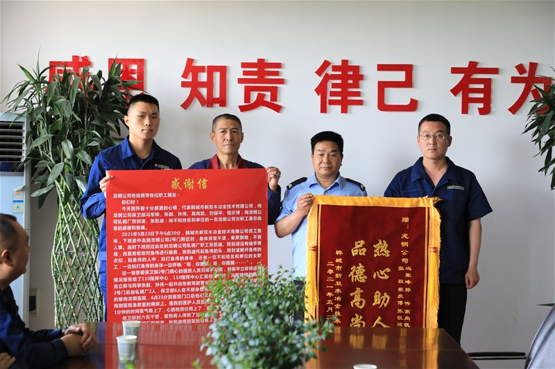 5月27日,同興公司協作單位韓城市新雙木冶金技術有限公司負責人,將一面寫有“熱心助人 品德高尚”的錦旗以及一封感謝信送到公司,對公司軋鋼廠職工賀創波等三人和保衛部職工馮軍鋒等六人表示感謝,感謝他們在關鍵時刻見義勇為,對外協單位職工魚偉施以援手的救命之恩和感激之情。