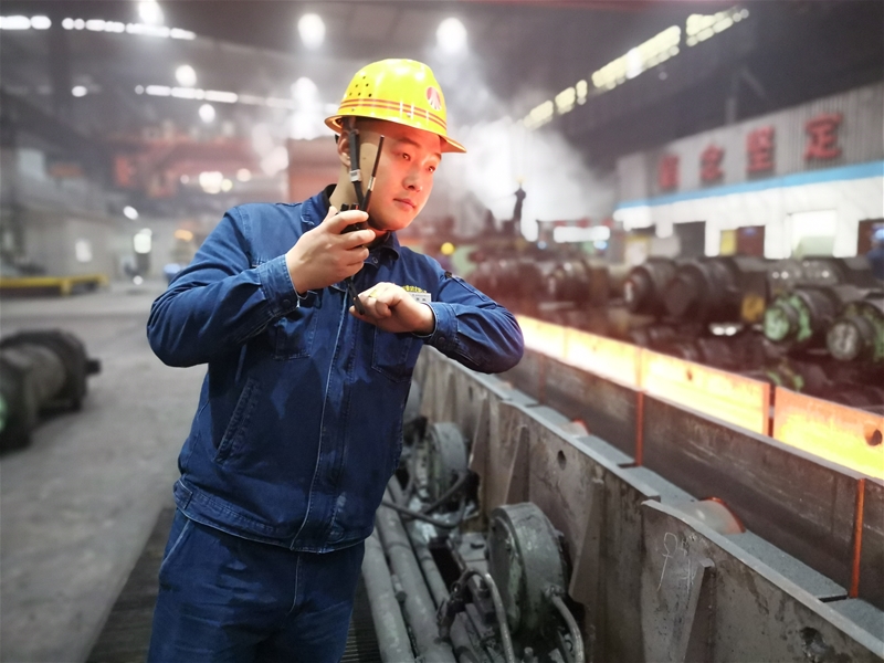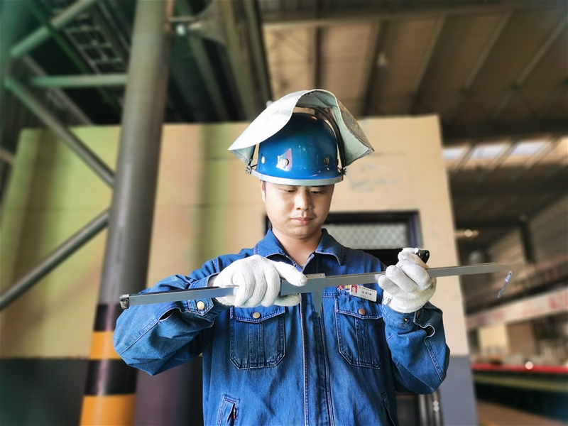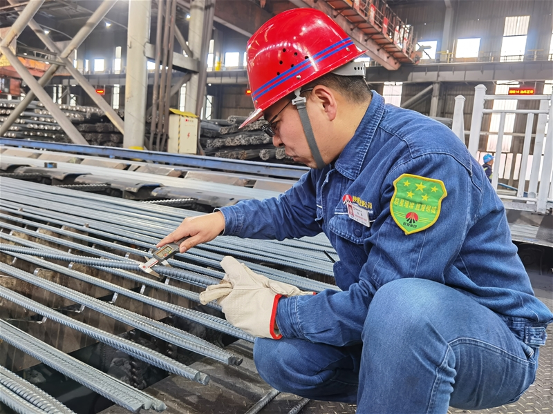 在周圍環(huán)境溫度達40℃的棒材三線,一股熱浪襲來,作業(yè)長張鑫顧不上炙烤,正用卡尺測量棒材幾何尺寸,以實際行動踐行“人人做精英,根根求精品”的“精”文化,確保生產(chǎn)出來的每一根鋼材都是精品。