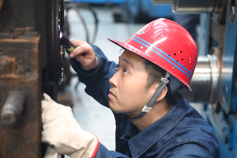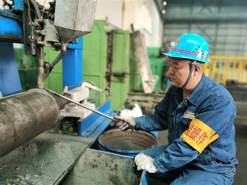 在板帶預(yù)裝工段,車工郝趙軍在堆焊機前,一邊加料,一邊對堆焊質(zhì)量進行監(jiān)護,汗水濕透了衣衫,但他依然堅守初心和匠心,將簡單的工作做到極致。