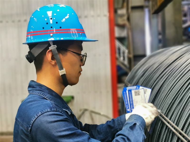 在40℃的高線成品區(qū),迎面撲來的“熱浪”對于標(biāo)牌工樊強早習(xí)以為常,他正穿梭于鋼卷之間,有條不紊地將二維碼標(biāo)識牌掛在鋼卷上,為鋼材出庫守好關(guān)卡,做好服務(wù)保障。