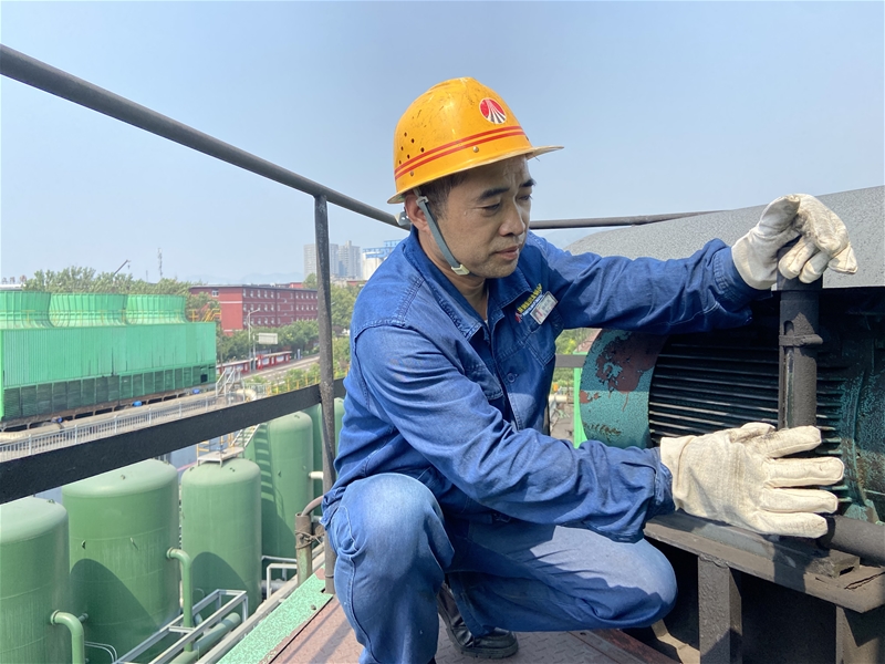 高達15米的冷卻塔塔頂,安全員楊利民正在對冷卻塔減速機油位進行檢查,他用專注與敬業(yè)護航設(shè)備順行,守護員工健康。