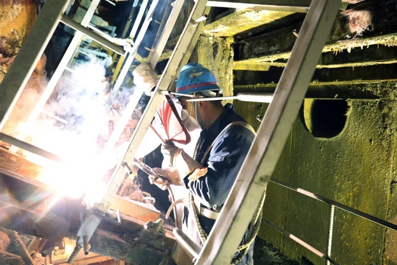 檢修現場 緊張有序 忙而不亂一個個忙碌的身影穿梭在各個角落他們在狹小的空間里拆卸裝置打磨焊接安裝設備璀璨的鋼花和叮叮咚咚的敲打聲熱鬧非凡