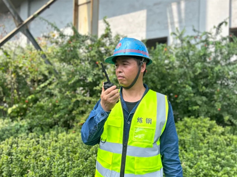 在煉鋼新區三次除塵檢修現場,班長許建峰頭戴安全帽,身著反光背心,目光如炬,揮汗如雨,正指揮著吊車卸載電氣柜,高空中太陽360度無死角直射,他全然不顧,忙得不亦樂乎。