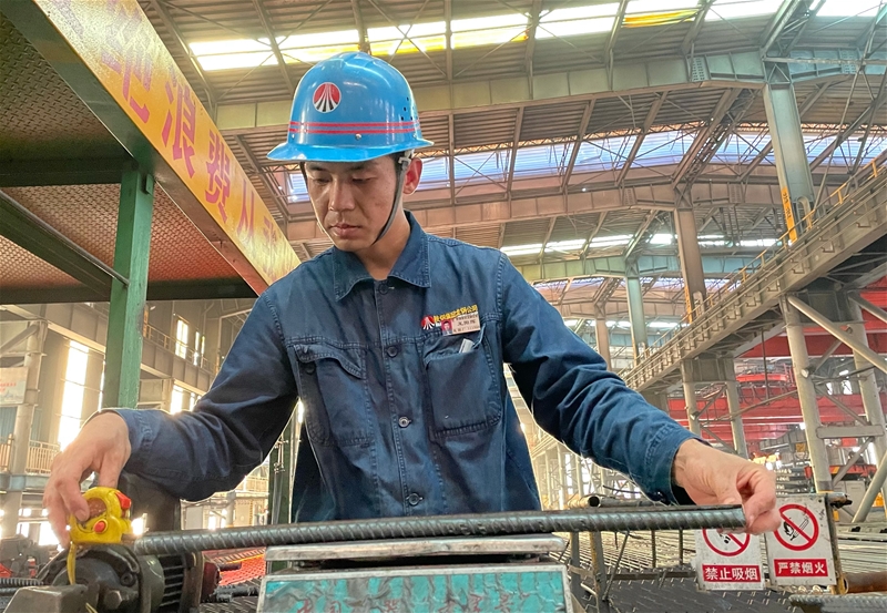 在軋鋼廠棒三生產線上,軋機轟鳴,鋼材飛馳……工人在各自的崗位上一絲不茍地工作。軋機一旁,軋鋼工長王陽輝正拿著卡尺細致地對紅鋼進行取樣,確保每支鋼材的直徑都在誤差范圍內……