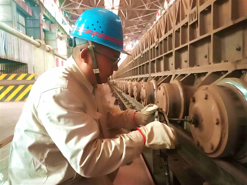 臺車軌道旁,臺車工薛峰虎正在對臺車滾輪區域設備進行潤滑保養,129個臺車見證了他日復一日的堅守,50℃的高溫環境“烤”驗著他,擺動帶、寬皮帶、燒結機、臺車小格……見證了他矢志不渝奮斗的青春足跡。