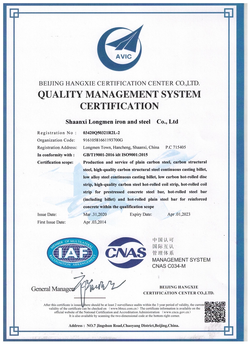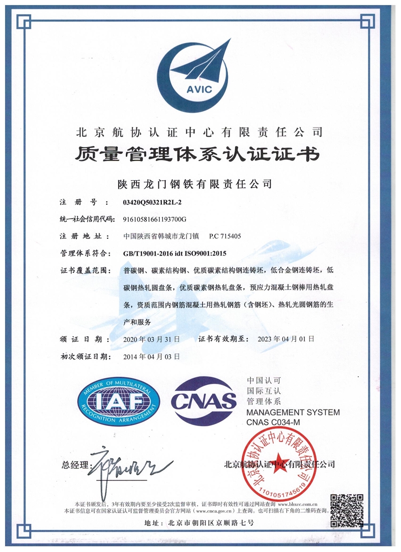 公司自1985年開始宣貫全面質量管理,1999年通過了ISO9001:1994質量管理體系認證, 2011年公司成功實施了質量、職業健康安全、環境管理體系一體化整合,建立了完善的質量管理體系文件,編制了一體化《管理手冊》及通用、專業程序文件,編制了《燒結廠工藝操作規程》、《煉鐵廠工藝操作規程》、《煉鋼廠工藝操作規程》、《軋鋼廠工藝操作規程》、《檢驗和試驗規定》、《理化檢驗操作規程》等一系列操作規程及各類作業文件,實現了從原料進廠到產品出廠全過程質量管控。在“堅持科學協調發展,提升績效持續改進;遵守法規控制風險,節能減排綠色低碳;打造“禹龍”百年品牌,不斷增強顧客滿意”的一體化管理方針框架下,制定了切實可行的質量目標,確保了體系持續運行的適宜性和有效性。