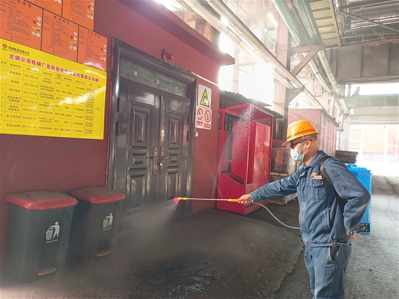 1月11日晚上11點,安全員肖鵬飛正在給陸續到崗的職工測量體溫,檢查口罩佩戴情況,并詳細詢問每個職工生活軌跡,然后一項項認真填寫到檢測表上,一項項工作緊張而有序。等交接班的職工全部檢查完畢,一切正常,肖鵬飛長舒了一口氣,緊接著他背起幾十斤重的消毒桶,開始對區域進行消毒,主控室、推鋼室、連鑄平臺,他來回穿梭在煉鋼廠,按時按點給各操作室消毒。他利用班前班后會組織職工學習《新型冠狀病毒感染的肺炎防控知識手冊》,督促引導職工在廠區內、崗位上、出入餐廳、乘坐通勤車時均能持續并正確佩戴口罩。他還不定期檢查各班組的消毒記錄、口罩銷毀記錄及“一人一檔”信息卡的更新情況,準確掌握職工身體情況,從嚴從實抓好疫情防控工作。