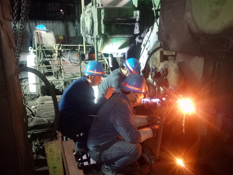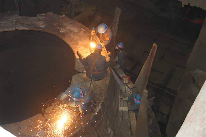 他們剛一停下來(lái),兩名維修工立刻上到爐體進(jìn)行焊接作業(yè)。由于停爐時(shí)間不長(zhǎng),爐體上的溫度高達(dá)七八十度,一般的鞋上去鞋底都會(huì)被烤化,他們站在上面要不斷地跺腳,防止鞋底被烤化。不光是這個(gè),站在上面,爐體上的高溫逼得他們快喘不過(guò)氣來(lái),干一會(huì)就要下來(lái)喘口氣。就這樣,一波又一波,直到作業(yè)全部結(jié)束,他們的臉上才露出開(kāi)心的笑容。