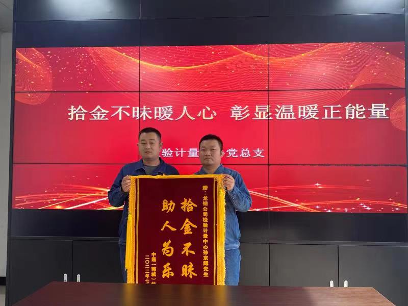 7月24日,王師傅為孫京輝送來一面“拾金不昧 助人為樂”的錦旗,并激動地說道:“龍鋼公司的職工,素質真高,為你們點贊!”