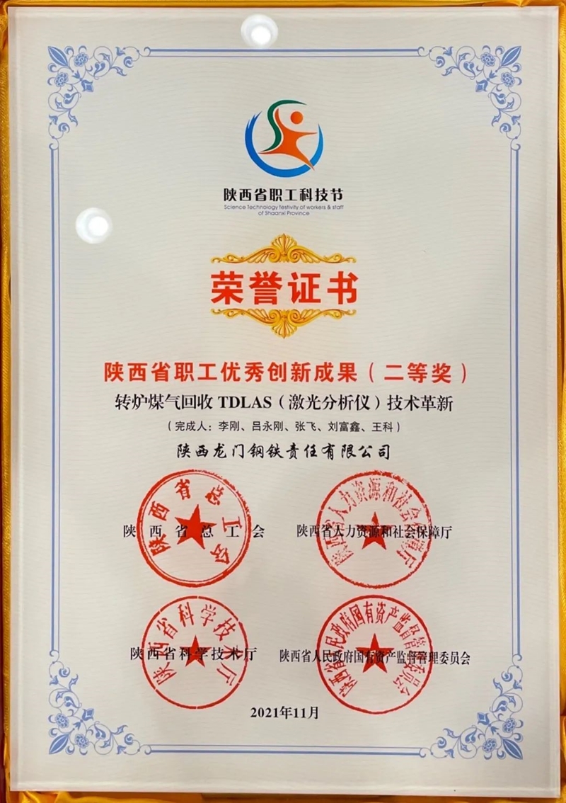 李剛、呂永剛、張飛、劉富鑫、王科聯合完成的創新項目《轉爐煤氣回收 TDLAS(激光分析儀)技術革新》榮獲陜西省第六屆職工科技節優秀科技創新成果二等獎