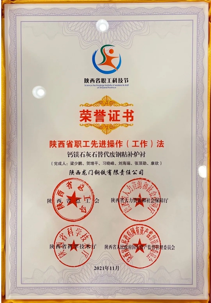 梁少鵬、賀增平、習曉峰、劉海瑞、張頂勛、康欣聯合完成的創新項目《鈣鎂石灰石替代廢鋼粘補爐襯》榮獲陜西省第六屆職工科技節陜西省職工先進操作(工作)法榮譽稱號。