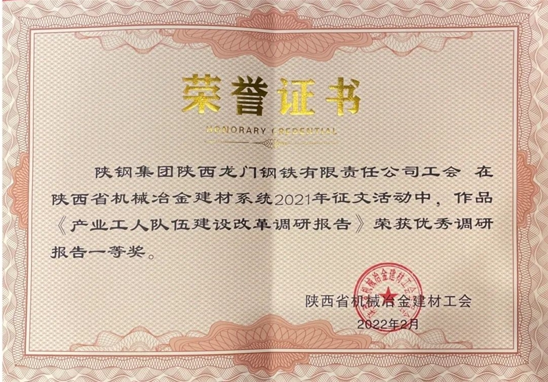 公司工會作品《產業工人隊伍建設改革調研報告》榮獲陜西省機械冶金建材系統優秀調研報告一等獎