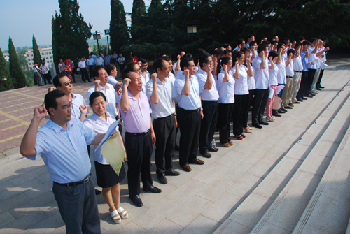7月1日上午,為紀念中國共產黨建黨92年周年,陜西陜化化工集團有限公司黨委組織公司領導班子和總經理助理、各基層黨委、黨支部書記和新黨員到紅色教育基地——華縣高塘鎮渭華起義革命紀念館參觀學習,并面對黨旗莊嚴宣誓,以特殊的形式迎接黨的92周歲生日。
