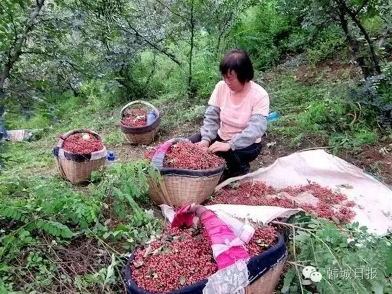 中午的太陽越發的熱,悶熱的空氣熱得摘椒人直冒汗,麻辣的花椒汁液滲進皮膚,花椒刺劃破的地方火辣辣地疼。我漸漸敗下陣來,蹲在地隴旁邊休息。看著那些來自四面八方,說著不同口音的花椒客邊說邊笑,手下麻利地采摘,想想她們可真堅強。二嫂頭發上裹著一條濕毛巾,手指上下翻飛,一會探出上半身夠樹上邊的枝條,一會彎腰,劈開花椒樹下邊細碎繁密的毛刺,順便還用鐮刀修剪一下那些樹干上冒出的嫩芽。聽二嫂說:八月份,是家鄉豐收的季節,這兩個月要手腳麻利,不能讓花椒熟過了,落地上了可惜。今年雨水好,花椒結的果多,三斤半濕花椒就能曬成一斤干花椒,花椒價格比過去翻了幾番,孩子們上學的學費,家里的開支全靠著花椒。原來,在家鄉村民心中,花椒就是他們的衣食父母,只要勤勞就能致富。