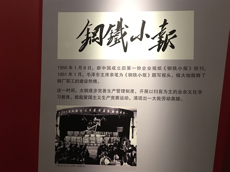 在“太鋼杯”全國冶金美術書法展覽上,得以觀賞來自四十余家冶金單位職工創作的油畫、國畫、版畫、真草行篆各類作品,讓人真切享受到一道文藝精神大餐。在太鋼廠史展覽館,代表們進入了一場八十四年的時光之旅。仿制的青磚灰瓦的西北鋼鐵廠大門,孫中山、閻錫山先生的黑白影像,瞬間將人拉回到實業興華、產業報國的上世紀初。毛澤東曾為全國第一份企業報紙,即太鋼《鋼鐵小報》題寫報名,令人對太鋼新聞事業的歷史心生幾分羨慕。館內的珠港澳大橋、軍艦、坦克、神舟三號、圓珠筆芯頭、手撕鋼等等元素,讓人更加驚嘆于太鋼產品在科技上的先進實力。