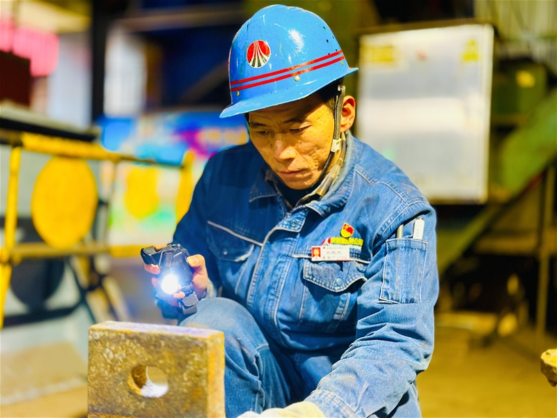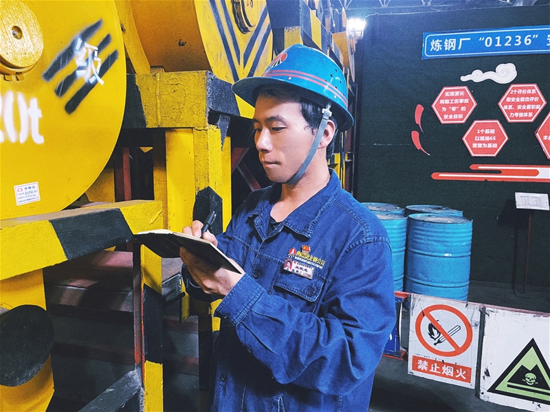 在火熱的連鑄生產(chǎn)現(xiàn)場,班長陳超所在的維修班嚴(yán)格執(zhí)行高溫天氣點巡檢制度,確保設(shè)備維護(hù)到位,聯(lián)鎖保護(hù)到位。悶熱炙烤的廠房里已是一片火熱,他們穿梭于臺上臺下,身上的藍(lán)色工服早已浸滿汗水。