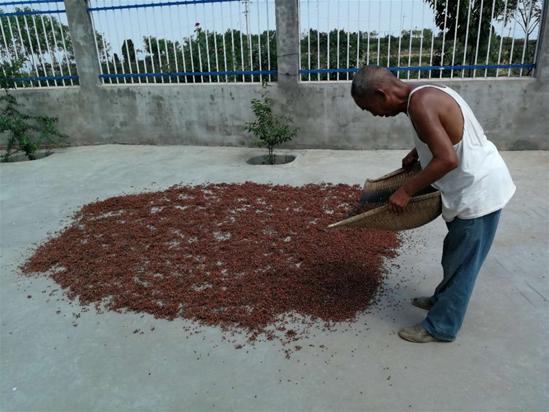 中午吃飯的時候,爺爺就不見了,只聽見院子里“嚓嚓嚓”的聲音,隨即我來到院子里看見爺爺在收花椒,摸了摸花椒還沒干就問爺爺:“爺爺,花椒還沒曬干怎么就收了。”爺爺說道:“這曬花椒不能曬的太干了,太干了花椒就碎了,不好脫籽”說著爺爺已經(jīng)將花椒掃成一堆,用木扒將花椒輕輕地拍打,使花椒籽從花椒上脫離出來,隨后將大部分花椒用木扒扒出來晾曬,剩下的花椒和籽混在一起不好分離,這時候爺爺就用簸箕將花椒和籽用他的多年技術給分離出來。看著爺爺干的好不熱鬧我也試著干了一會,發(fā)現(xiàn)花椒粒沒有從花椒籽里分出來,它們還是混在一起,看來這個活還得慢慢積累經(jīng)驗。